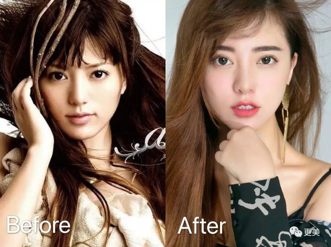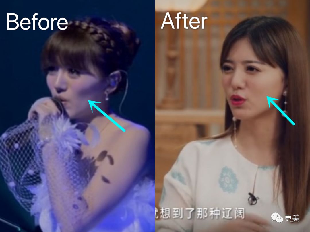 双眼皮疑似做了加宽,眼睛看起来更大。内眼角形状也发生了微妙的变化,变得更尖锐精致。