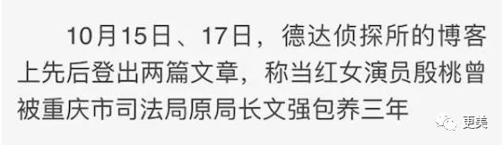 说来话长,09年殷桃正红的时候,被署名为“德达侦探所宋祖德”的博主接连发文,称殷桃曾被某“黑老大”包养三年,这个传说中的“黑老大”就是重庆市司法局原局长文强。
