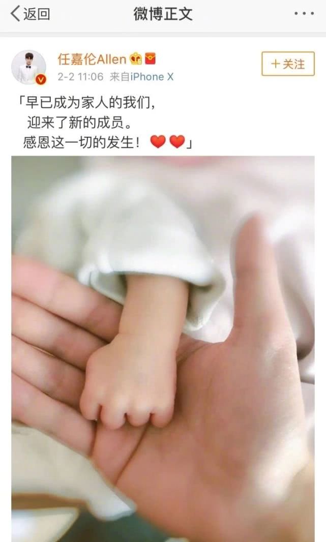 时隔一年,任嘉伦再次送给了粉丝们一个大大的惊喜(惊吓),跳过结婚证不走,直接在微博宣布了当爸爸的消息。2018年的2月2日,任嘉伦在微博晒出了一张牵着小baby手手的照片,表示:“早已成为家人的我们,迎来了新的成员,感恩这一切的发生。”