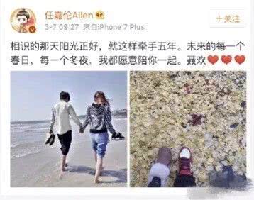 但令人没想到的是,正处于事业上升期的任嘉伦,突然就宣布了恋情。别的艺人都是被拍到之后还死不承认,但任嘉伦就不一样了,没有被拍到反而还主动宣布恋情,给他的女友粉来了一个致命的打击。2017年的3月份,任嘉伦发微博表示:“相识的那天阳光正好,就这样牵手五年,未来的每一个春日,每一个冬夜,愿意陪你一起,喜欢”,并晒出与女友的牵手合照。