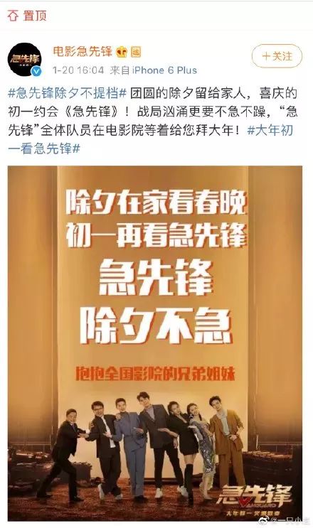 未准备提档的影片《急先锋》借此机会进行营销,打出“除夕在家看春晚,初一再看急先锋”和“抱抱全国影院的兄弟姐妹”的宣传语。春节档尚未正式开启,浓浓的火药味就已经燃起。
