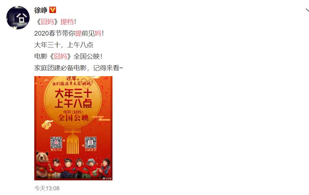 有趣的是,就在今天中午一点零八分,徐峥发布微博,宣布“《囧妈》提档至大年三十上午八点”。