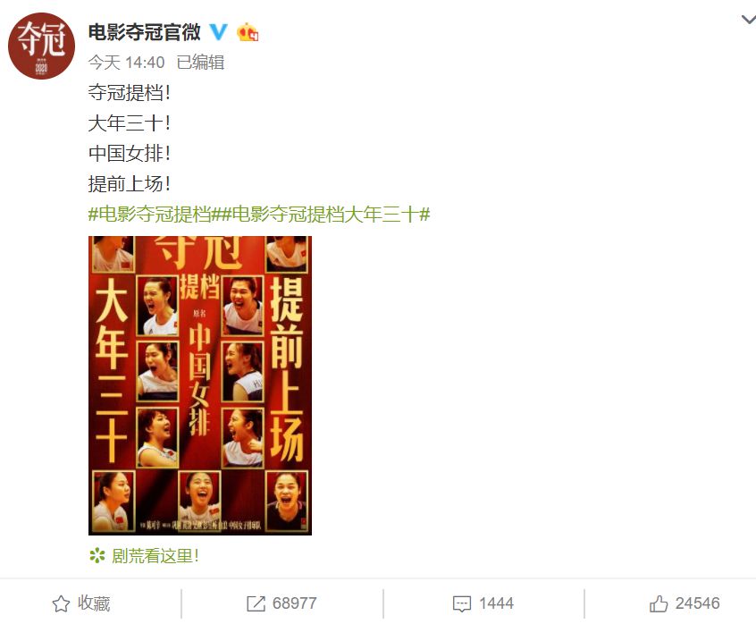 两点四十分,刚度过审查风波的影片《夺冠》也确定提档。