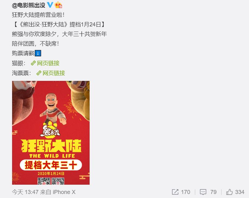 一点四十七分,微博“电影熊出没”宣布《熊出没》也提档至大年三十。