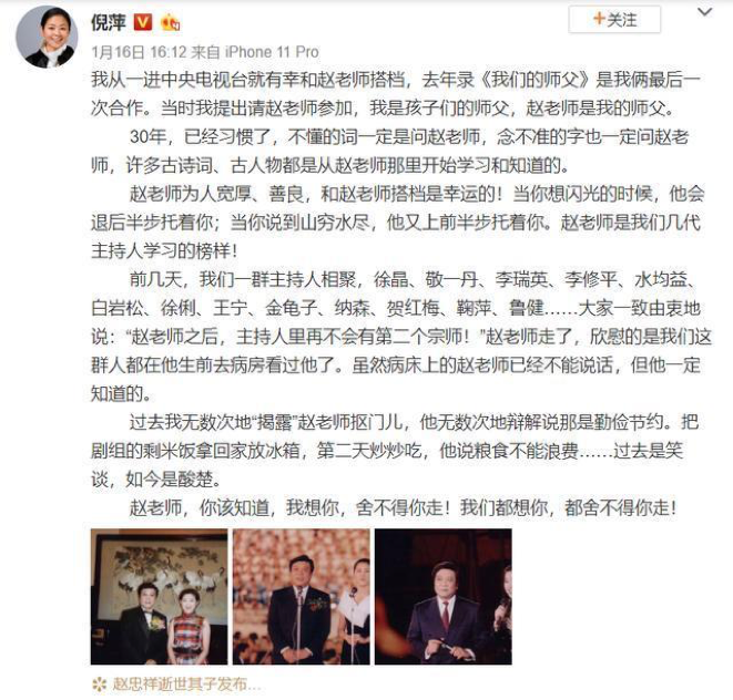 其实在1月16日,倪萍在得知赵忠祥离世的那天发表了一片长文,字里行间里已难掩悲痛之意。