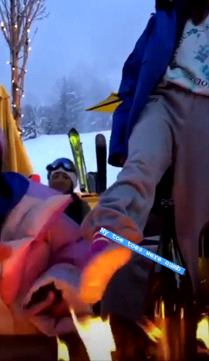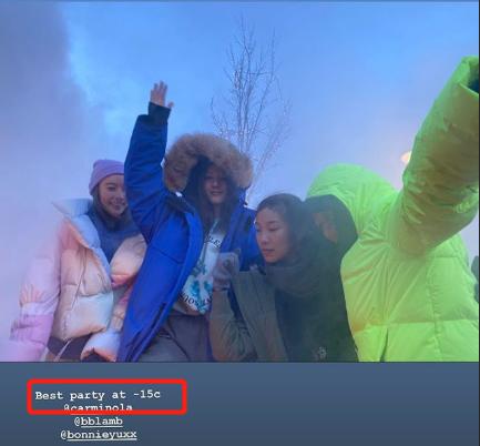 吴千语和好友一起围着火堆暖手,还表示:“my toe toes were numb(我的脚趾麻木了)。”在零下15度开party可把吴千语“冻傻”了,火堆只能暖得了手,却无法顾及到脚,为了玩也是很拼了!