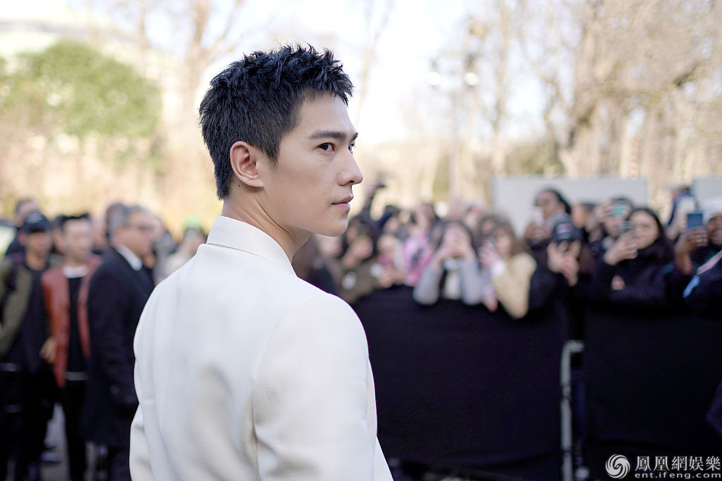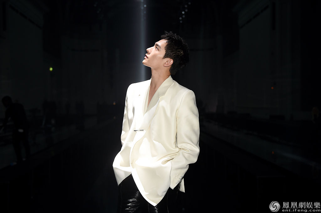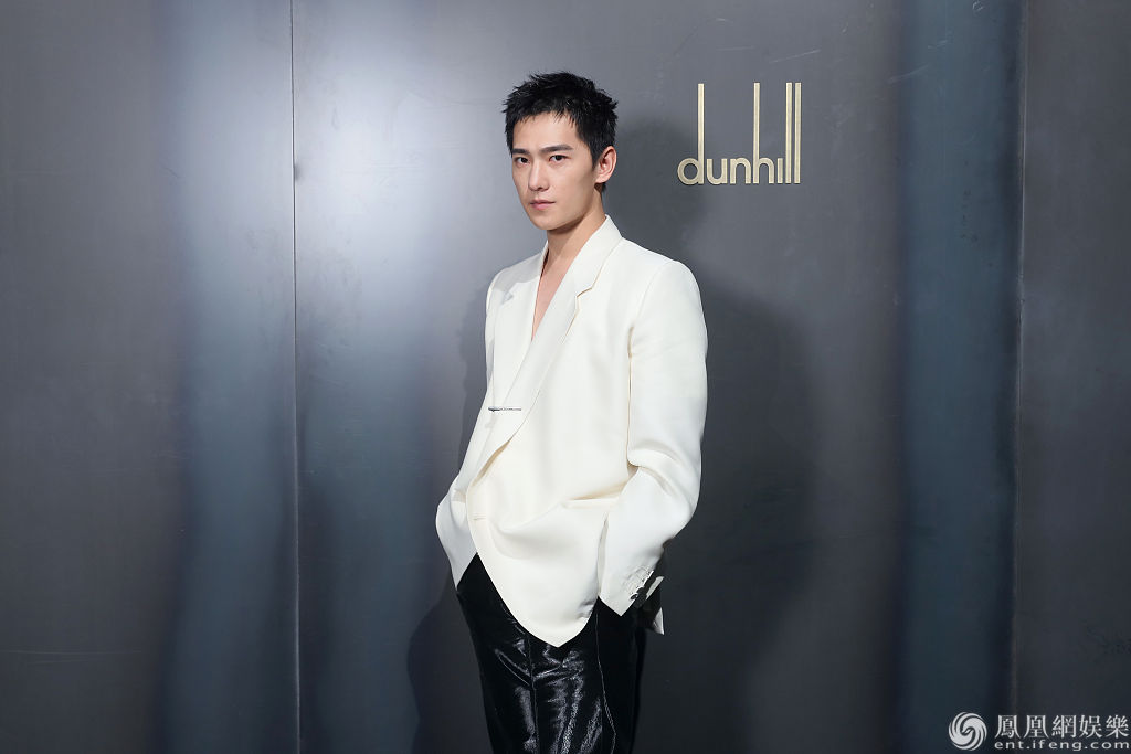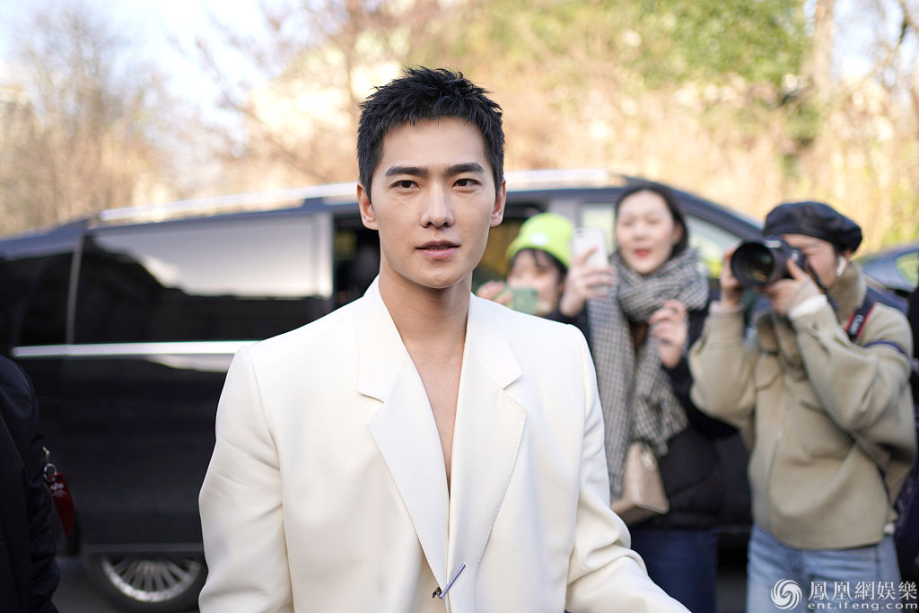 当地时间2020年1月19日,法国巴黎,2020秋冬巴黎男装周,杨洋等明星现身助阵 Dunhill 秀。当天,杨洋真空穿白色西服罕见秀性感,胸前简约别针点缀造型,搭配黑色皮裤质感十足,走路生风长腿撩人,一亮相便引发不少关