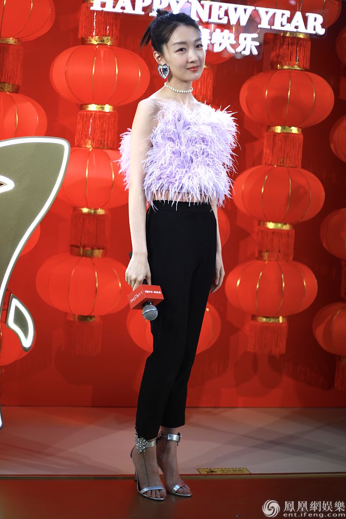 周冬雨穿紫粉色的羽毛露脐装美丽冻人,秀香肩锁骨,身材娇俏精致可人。