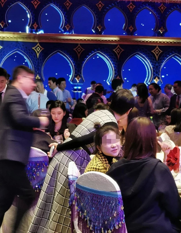 在酒席上,奚梦瑶不时托腮,像是在和同桌的人聊天,何猷君却不见人影,不知道是不是坐在另一桌上呢?