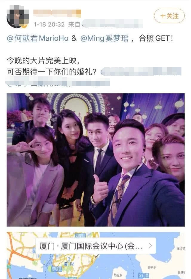 近日,何猷君与奚梦瑶结伴赴厦门参加婚礼被认