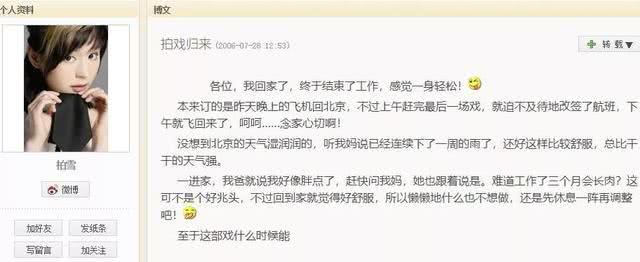 然而这时,柏雪却突然消失了,不仅没再拍戏,博客也在06年7月28日后停更了。难道是退出演艺圈了?可从最后一条博客来看,根本没有隐退的迹象呀!
