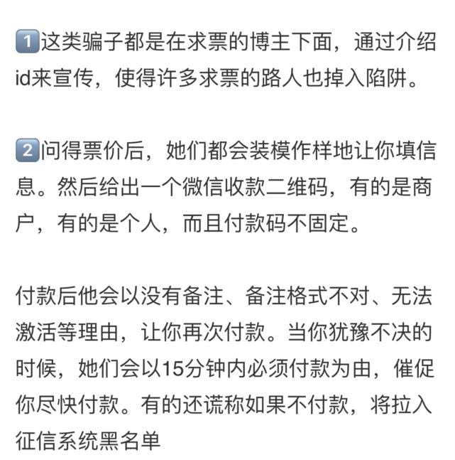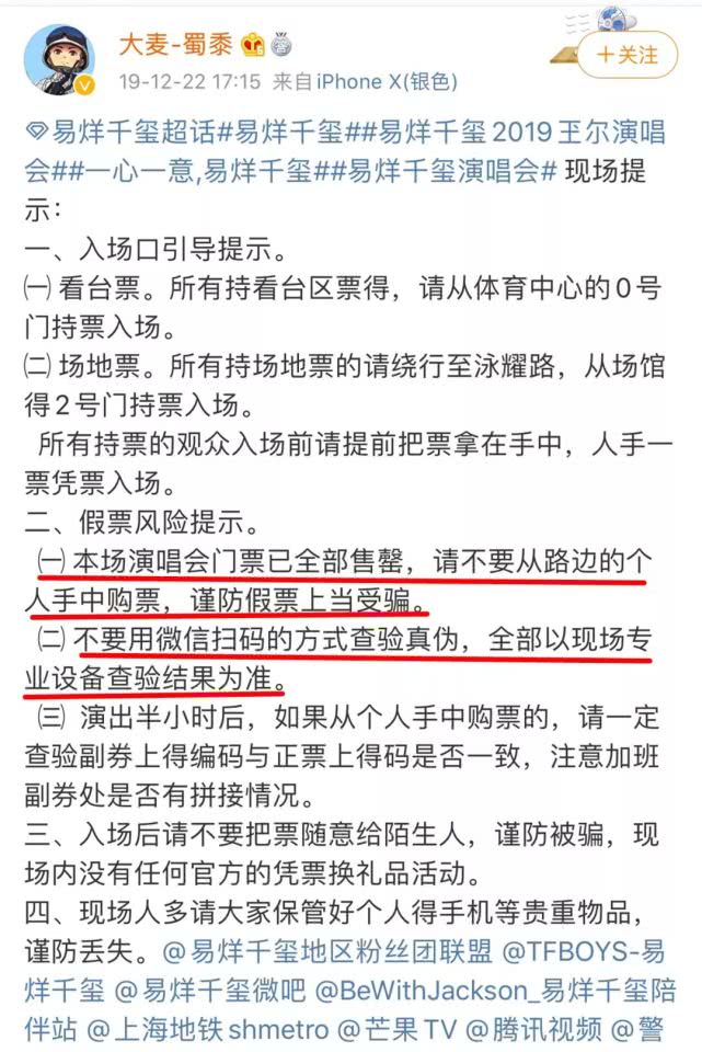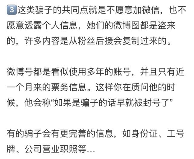 编辑:阿喵 橘一直以为明星看演唱会很方便, 让工作人员找找关系就能进, 看了霍思燕的采访才知道, 原来她为了追星也问过黄牛?!! 只是最后觉得价格太贵, 干脆坐在门口听了。 这就叫咱不缺钱,但也坚决不向黄牛低头, 可以可以,霍姐娱乐圈理智追星第一人! 但确实,现在黄牛票的价格是越炒越贵,成倍成倍的翻... 听说原价1000多的前排门票都被炒到上万了... 但黄牛红利越来越大,非法卖票的坑也越来越深... 不是所有姐妹都像霍思燕这么理智, 所以掉进坑的人是一个接一个▼ 比如下面这位姐妹,看演唱会看到了警察局, 还把被骗经历录成了视频。 过程还真的是跌宕起伏。 演唱会开场前半个小时,她想以600的价格买780的票, 有个阿姨谎称自己手里的票是儿子的,他有事看不了了。 (您还不如说是女儿更有信服力) 这姐妹还算聪明,知道扫一扫辨真假, 当时支付宝、微信都可以扫出来, 但购票正规渠道大麦扫不出来,她们就没要。 但谁知道扭头就掉入第二个假票陷阱, 害,姐妹看哥哥的心情太迫切了, 其实第二张大麦也没扫出来,但她还是买了... 还用说吗?绝对进不去... 最后的结果是花了六百块钱, 去警察局逛了一圈, 并产生了想交男友的想法。 (姐妹你也是会抓重点的) 别说普通粉丝了,有时候就连身为警察的追星小姐妹,也会被骗子迷惑。 像这位郭顶的女粉丝,在网上找转票的, 碰上一个贼入戏的骗子,说自己因为面试去不了。 一般以这种生活化理由开场的,很有迷惑性。 再加上对方还发了电子票截图,警察小姐妹便信了。 害!可以理解,大家为了见偶像都特别迫切, 只要有一点能有票的机会,就选择相信。 人之常情。 还好啊!!! 转钱之前她说了一句话,“我是警察。” 吓得骗子立刻把她拉入黑名单。 警察姑娘也笑了, 万万没想到工作的第一份笔录是给自己做的。 一查才发现这骗子之前还骗过了很多人, 还好最后给抓起来了。 女警姑娘提示:网络交易有风险, 还是要在正规平台买票呀! 你们觉不觉得黄牛都可以去演戏, 一个比一个会装... 下面这位更是厉害▼ 周杰伦在南京开演唱会的时候, 粉丝A某在场馆外找了黄牛问价。 他本来不确定票的真假有点犹豫, 但这个黄牛可会吓唬人, “你爱买不买,反正有人买。” 这家伙给粉丝唬住了,乖乖交了钱, 但到检票的时候就懵了,是假的... 以上这几种情况绝对不少见, 但都是个别粉丝被骗。 我见过最惨的是吴亦凡的粉丝... 去年的抖音盛典,凡家粉丝团票被骗, 足足有900多人在场外进不去, 只能拿着灯牌在场外给爱豆应援。 那次活动橘也去了, 真的场外一条街都是吴亦凡粉丝, 大家都在喊:抓黄牛,抓黄牛! 听说还有很多是从外地专门过来的... 真的太心疼她们了... 懂这种心情,橘也被黄牛骗过。 当时去看某卫视的跨年演唱会, 众星云集票很难搞的那种。 但那个黄牛拍着胸脯跟我说绝对有票, 还拍了票的照片,稚嫩如我坚信不疑, 交完五百块钱的定金后, 买了根烤肠迈着愉快的步伐走向场馆。 然后到门口就慌了, 对方微信拉黑、电话打不通...... 联系半小时怎么都找不到人, 手里的烤肠都不香了...... 旁边同是黄牛的阿姨说, “被骗了?这次票根本就没有多少张, 说保准有票的90%是假的, 你看我这全是假票,你要吗?碰碰运气?” 我惊了:现在的黄牛好狂妄啊, 直接跟我说她的票是假的??? 给我气死,最后坐在场馆外听了一小时, 实在太冷就回家了...... 从那以后,我就摸清了黄牛的把戏, 其实都很so so,骗局无非就是下面几种。 第一种是没有票假装有,这种多在网上行骗。 举例说明,骗子的行骗方式▼ 大家可以去找大麦网客服问问, 从来没有过所谓的“线上出票员”。 第二种就是在演唱会门口吆喝自己有真票。 其实手里全是假票。 他会让你用微信或支付宝扫, 扫出来就忽悠你这是真票。 但其实演出门票多为芯片票纸, 用微信等任何方式进行“扫码验真”的方式,并不能代表票就是真的。 而且真票纸背面的金属线是一整条半嵌入式的, (可以借鉴人民币防伪金属线的查验方式) 假票的是一节一节,不是一整条的。 光说你们可能搞不明白,贴心如橘立马上实操视频。 如果大家还有很多困惑, 可以关注一下大麦-蜀黍这个账号, 这是大麦官方工作人员的私人账号, 橘已经帮你们认证过了,靠谱的狠, 经常会发一些骗子名单以及注意事项, 几乎每场演唱会他都会频繁发博以防更多人被骗。 老操心了。 比如前段时间千玺的演唱会, 开场前还在疯狂提醒本场演唱会门票售罄, 千万不要随便从陌生人手里买票以防受骗。 关注这个号,相信会对你有用的。 当然,也有一些有真票的黄牛, 但他们的价格并不是很多人可以承受起的, 而且长期这样下去,只会破坏整个演唱会行业的发展, 所以才会有很多明星以及粉丝团公开抵制黄牛,呼吁正规渠道买票。 李宇春就是第一个,粉丝们也把黄牛抵制的很彻底! 拉横幅痛批▼ “演唱会不买黄牛票是对春春音乐最大的尊重。” 这话已经被玉米们谨记在心。 鹿晗很讨厌黄牛这事, 想必大家都有所耳闻。 不管是演唱会还是活动, 坚决不给黄牛一点机会, 坚决不能让粉丝被骗钱! 所有的门票都要从官方抢。 鹿哥真是从始至终都很man。 当然说起抵制黄牛扛把子, 华晨宇家也必须得有姓名。 歌迷会会严格审查反复确认, 如有黄牛混进来团票立刻退款。 还有很多公开抵制的,咱们不一一说了, 反正核心重点