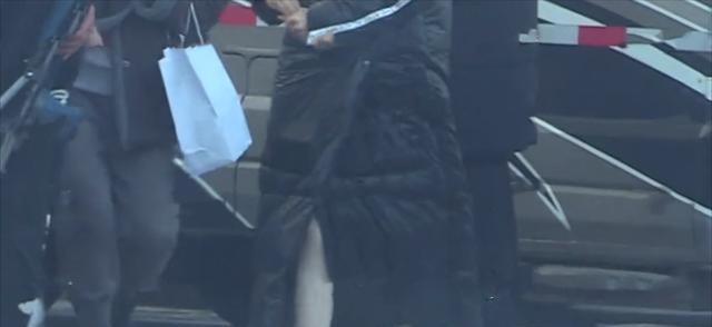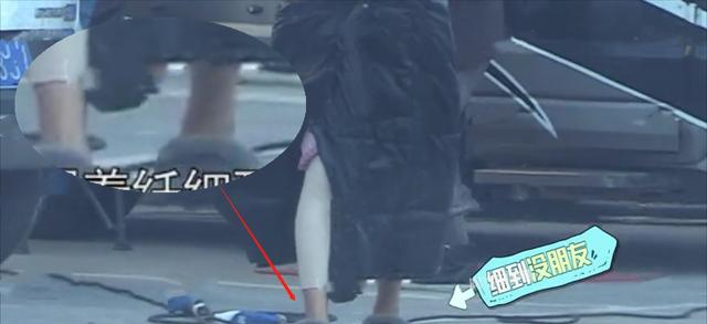马伊琍脚上竟然穿着棉拖,大衣里边似乎还是睡衣睡裤,应该是一大早到片场拍戏时就是这个打扮,看来是起床就套上大衣出门了。