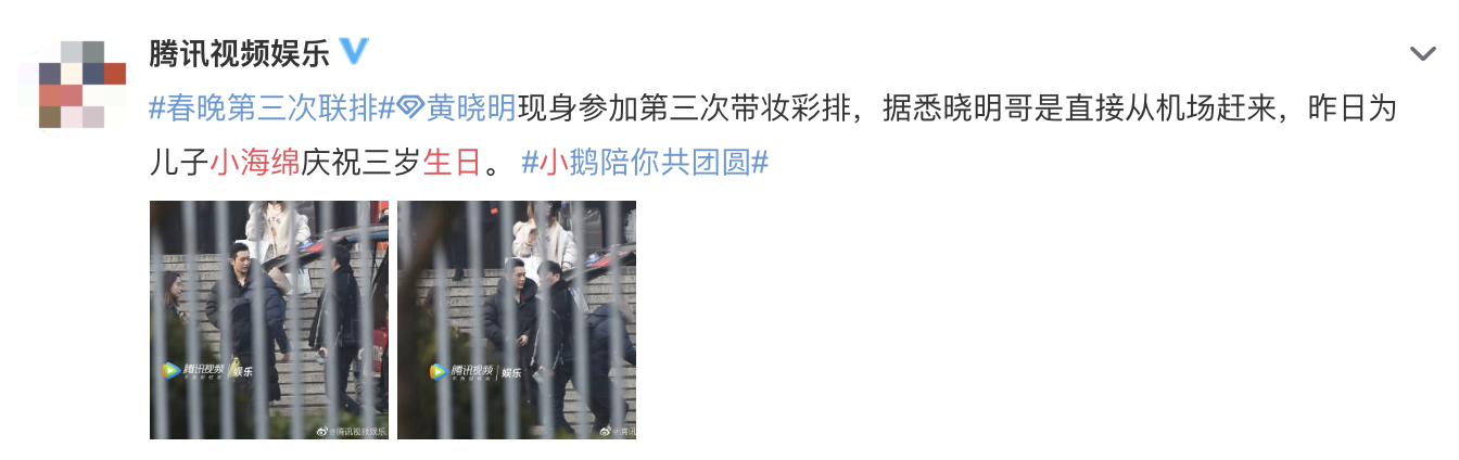 但从该网友拍摄的现场照中,却并没有看到黄晓明的身影,不少网友都纷纷疑惑,难道是黄晓明太过忙碌赶不过去?毕竟就在1月18日当天,黄晓明还参加了春晚的第三次彩排。不过也有媒体透露,黄晓明是给孩子庆生之后,直接从机场赶去彩排的。