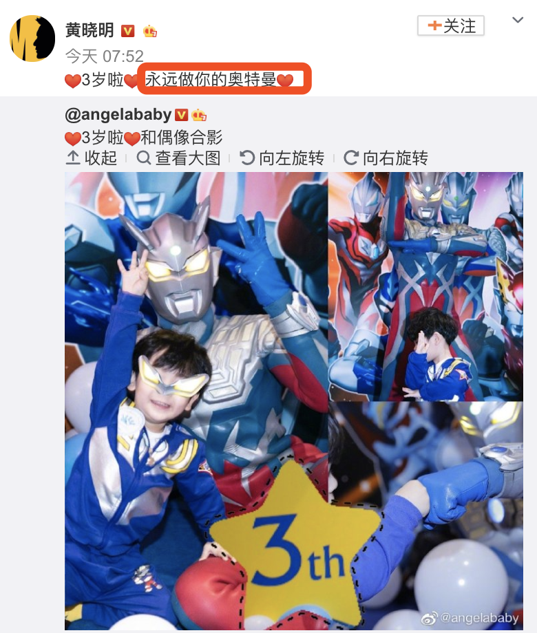 而翻看1月18日一早,黄晓明转发老婆baby给儿子庆生的博文来看,配文是“永远做你的奥特曼”,似乎透露了扮成奥特曼给孩子庆生的那个就是自己。