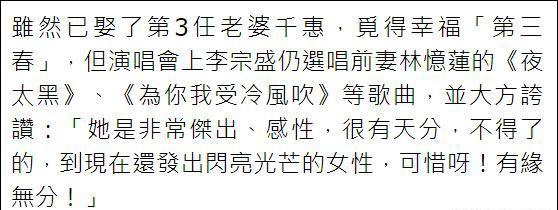 尽管太太就在底下捧场,但李宗盛畅所欲言,谈及和前妻往事,并指林忆莲是非常杰出、性感、很有天分,不得了的,到现在仍散发着闪亮光芒的女性,又感叹,“可惜呀!有缘无分。”