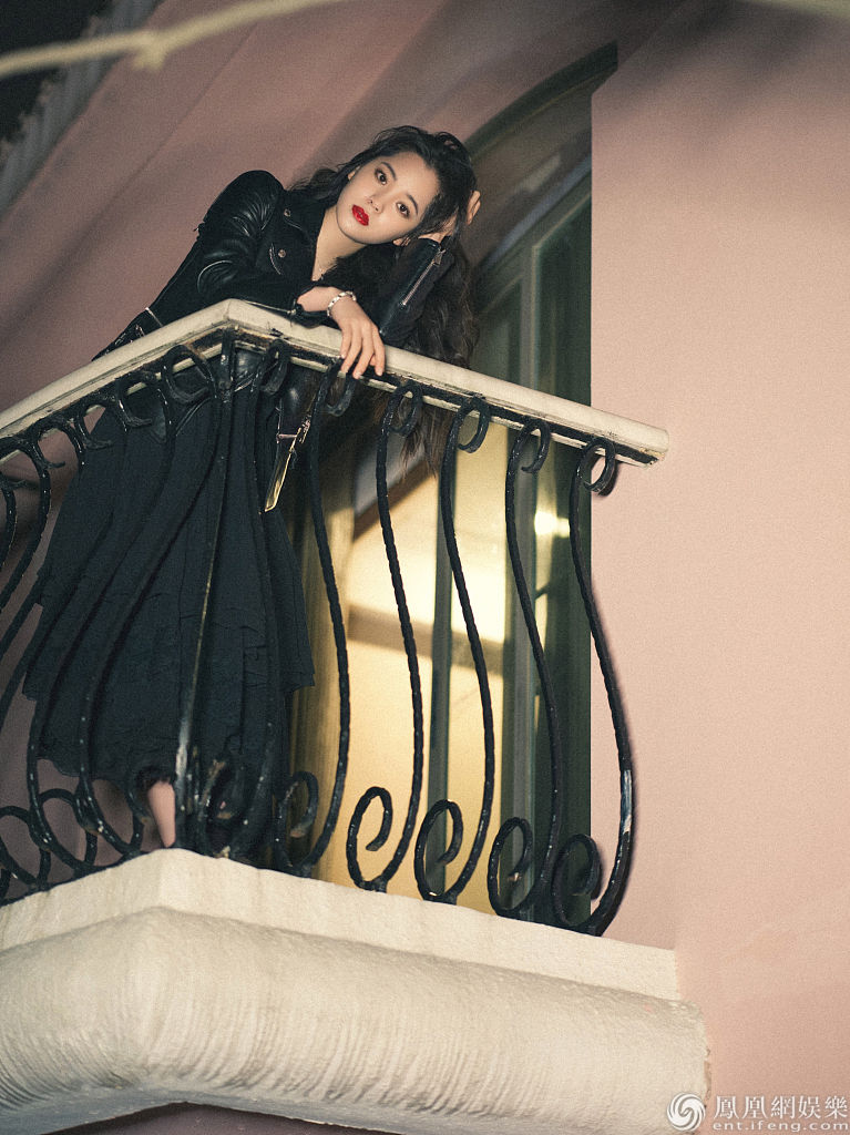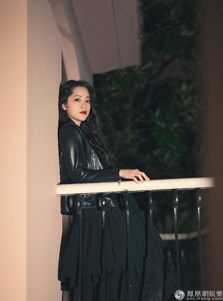 欧阳娜娜穿黑色皮衣搭配同色系吊带纱裙,脚踩短靴利落帅气,All Black造型甜酷兼具。
