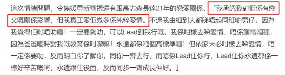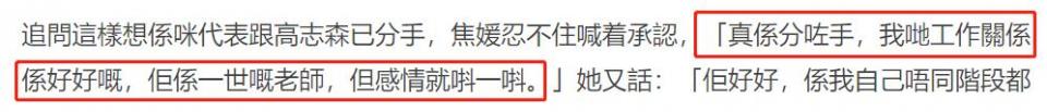 而重新思考了对父亲的态度后,焦媛也整理了对爱情的看法,认为被对方引领的爱情是辛苦的,需要一起进步成长。记者问这话的意思是不是分手了,她也大方承认,是分手了,不过工作上还是关系不错,高志森是她一辈子的老师,但感情可以停一停。