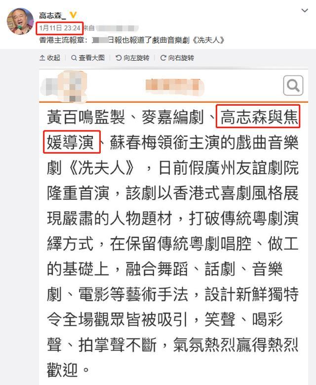 不过这些年两人一直相互扶持,甚至还传出要结婚消息。焦媛在一些采访中,不婚不育不买房的观念,令人印象深刻。两人工作上合作不断,就在几天前高志森还在网上宣传两人一起执导的音乐剧在广州表演,不像是分手的样子。