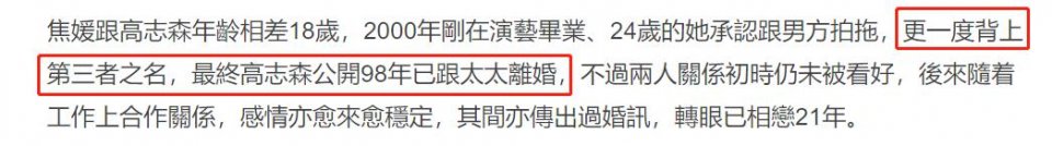 据悉,两人刚公开恋情时,高志森因导演《开心鬼》、《家有喜事》、《我和春天有个约会》等等电影,已是香港影业鬼才,焦媛却刚刚崭露头角,网上很多人骂焦媛小三上位,尽管高志森说自己早已离婚。