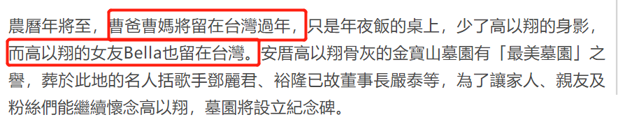 马上就要迎来农历新年,据悉高以翔的女友也也将和他爸妈一起留在台湾过年,只是今年的年夜饭桌上,再也没有了高以翔的身影,想到这里不禁让人潸然泪下。