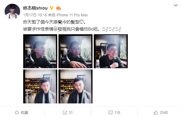 修杰楷发文称自己只会模仿Bo妞。