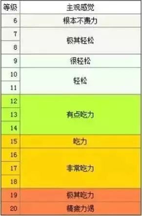 也可以根据自己训练时的感觉对照“RPE等级量度表”判定,把运动强度分成1~20个不同等级,分数在12~15分之间较为合理。