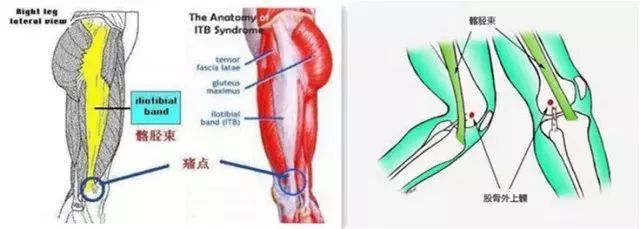 这其中最主要的影响因素是髂胫束,它从髋骨一直延伸到小腿骨外侧的肌腱,当它收缩时膝盖+髋骨+臀肌外侧就会陷入紧绷,长久下去就会陷入髂胫束摩擦症候群,会让髋关节掉进疼痛的无尽黑洞。