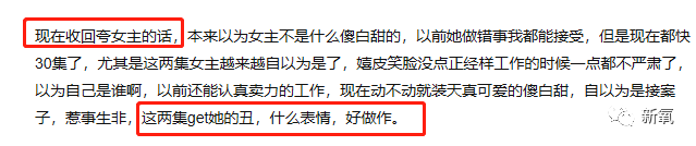 一开始有人发帖说她演的不错,符合普通上班女孩,没演大美女。 但没过多久,又更新补充,表示要收回夸女主的话,已经get了她的丑,觉得做作。