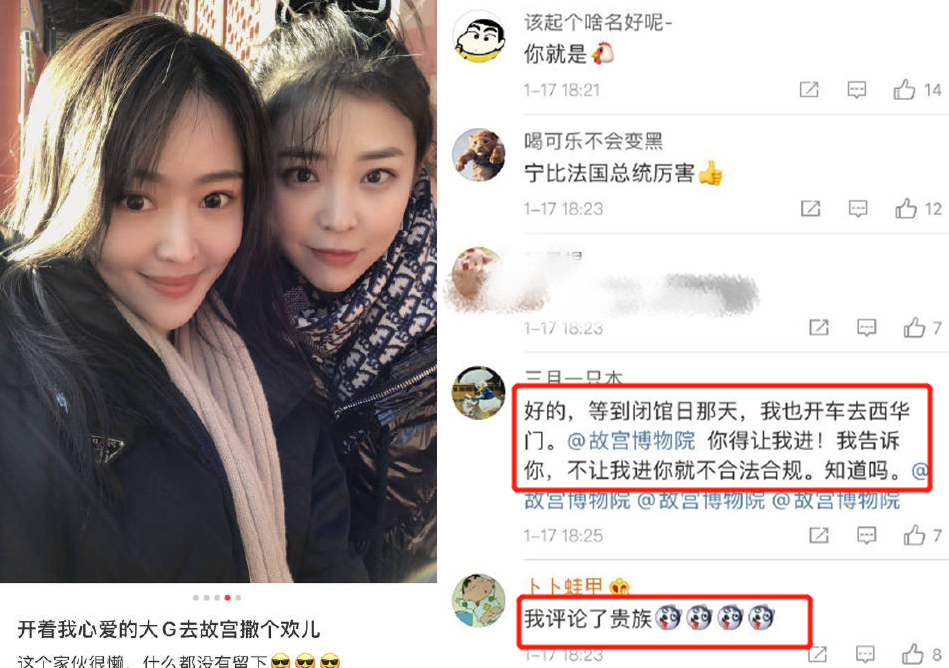 不过这次开车进故宫的图片曝光之后,该空姐又曝光了另一条动态,为自己做辩解,不过网友们并没有买账,反而是开始调侃起来。目前这两条动态都已经被该空姐删除。