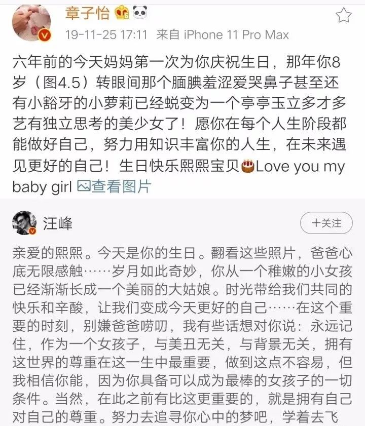 19年小苹果生日,汪峰发长文庆祝女儿的生日,章子怡也转发了文章,以妈妈的口吻祝福小苹果。