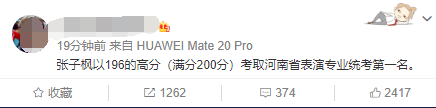 原标题:妹妹优秀!张子枫获河南省表演专业统考第一名 满分200得1