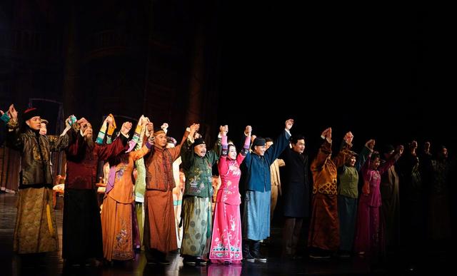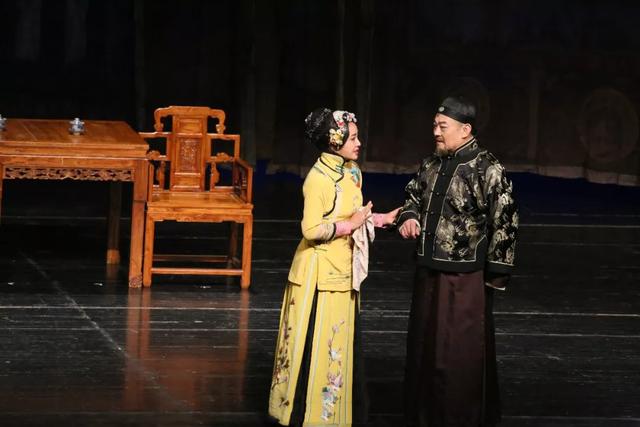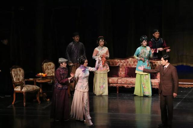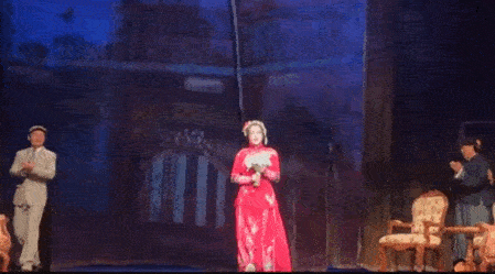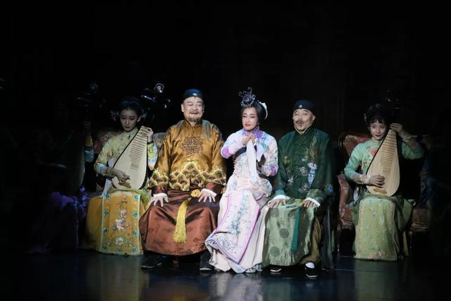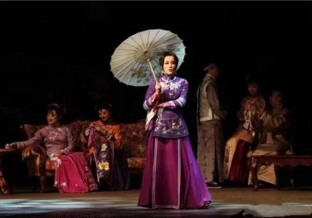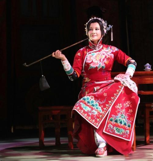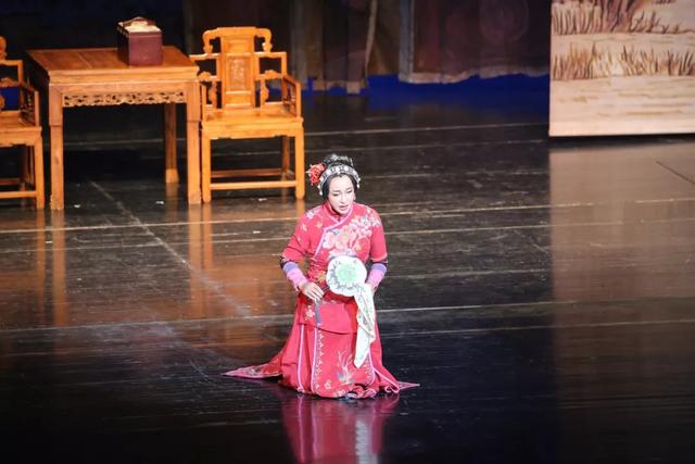 刘晓庆中间还换了一套红色霓裳,手持扇子与手绢,装扮得如此喜庆,却跪在地上,氛围有些悲伤。不过生着病的刘晓庆在舞台上演出,依旧完美地演好每一个小细节,大概投入到了话剧中,早已经忘了自己是个病人了吧!