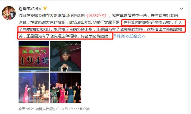 刘晓庆的经纪人此前也发文,称:“在开场前晓庆姐还高烧39度,但为了热爱她的观众们,她仍咬牙带病坚持上场,正是因为有了晓庆姐的坚持,在这场演出才能如此完美,正是因为有了晓庆姐这种精神,传奇才必将继续!”