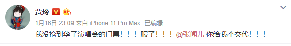 贾玲发文道:“我没抢到华子演唱会的门票!!!服了!!!”最后艾特经纪人张闻儿,要求对方给自己一个交代。