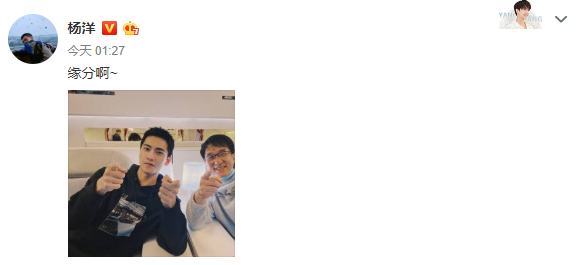 1月17日凌晨,杨洋晒出巴黎之行与成龙偶遇的同框照,并配文:“缘分啊”。两人飞机上偶遇心情好,双手指向镜头笑容治愈。