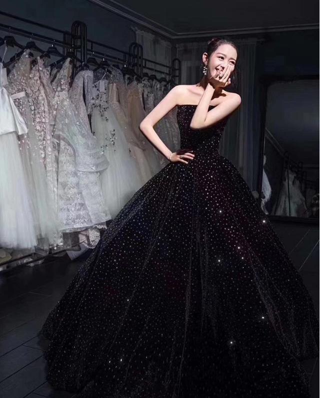 吉娜身穿的黑色礼裙非常漂亮,上半身是修身的抹胸设计,既秀出性感的锁骨,又勾勒出她完美的身形线条,傲人的上围与纤瘦的水蛇腰兼得,很是让人羡慕了。裙身的下摆十分华丽,上边还点醉着星星点点的碎钻,更加彰显吉娜犹如公主般的高贵气质。