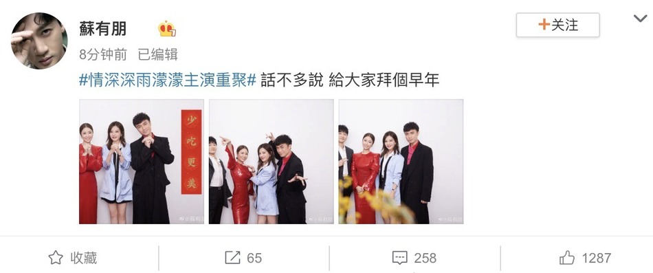 1月16日,苏有朋晒出《情深深雨濛濛》主演重聚合照,并配文:“话不多说,给大家拜个早年。”照片中,苏有朋与林心如、赵薇、古巨基开心地摆着pose,关系超融