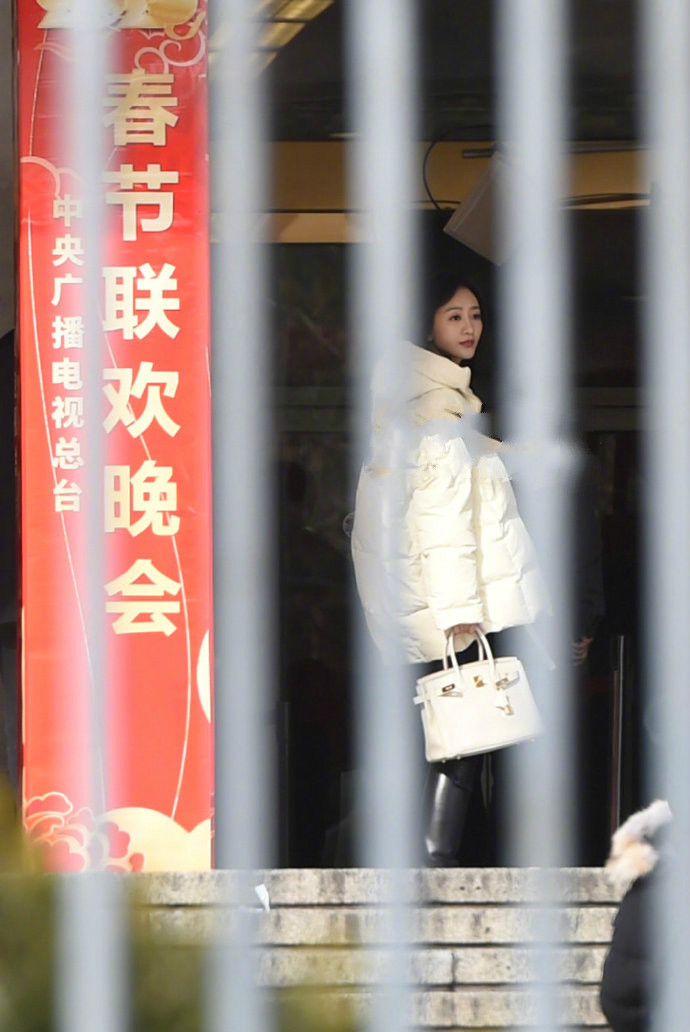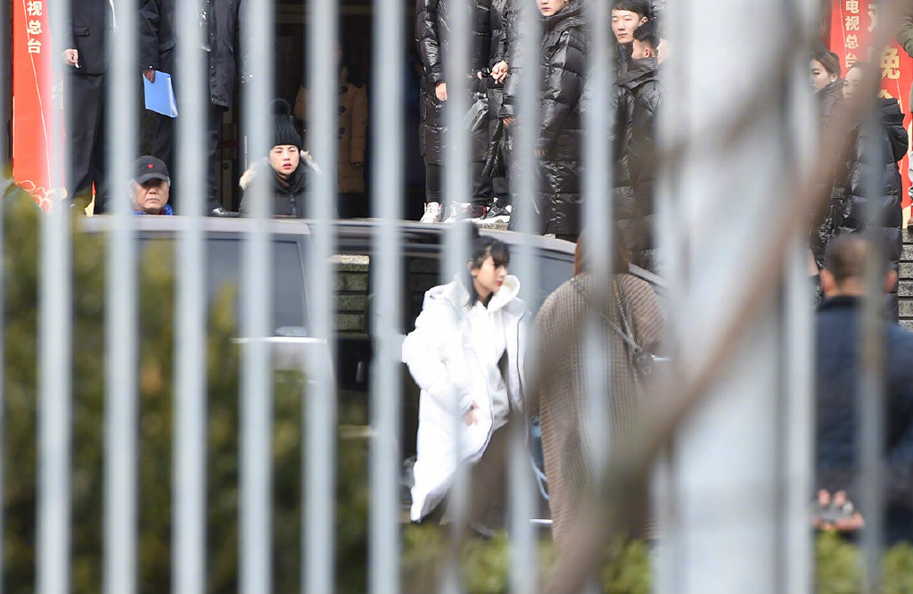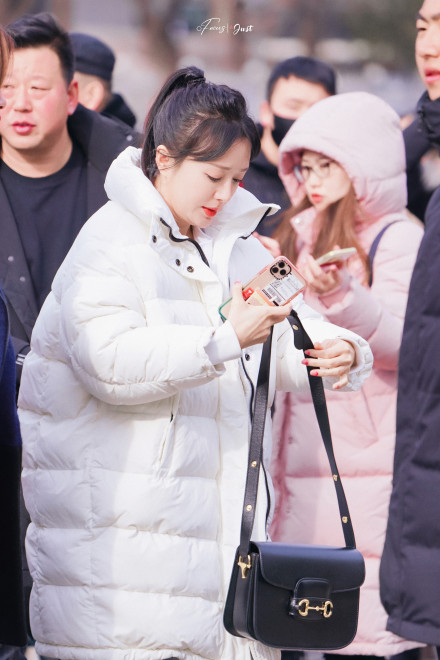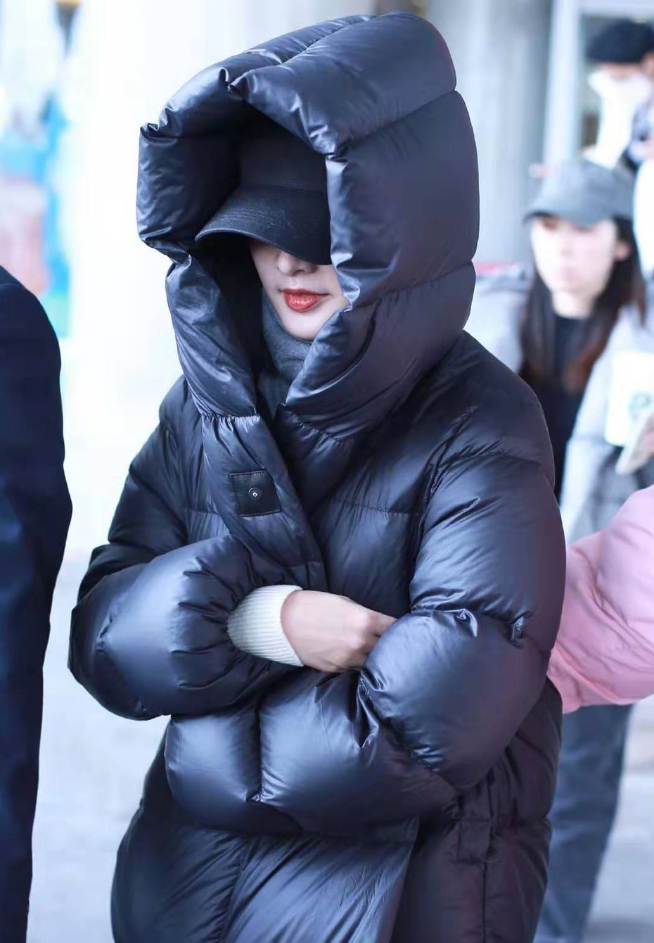 李沁身穿羽绒服包裹严实,妆容精致低头甜笑。