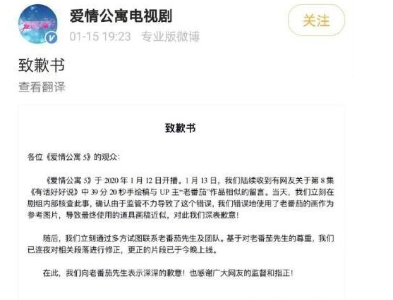 1月15日,备受争议的《爱情公寓5》官微发表声明,承认了抄袭剧中画抄袭UP主“老番茄”的作品,并对“老番茄”先生及团队表达歉意。