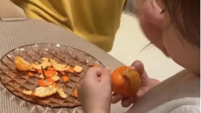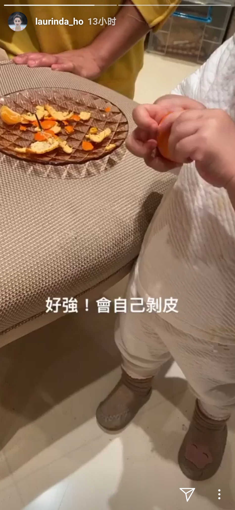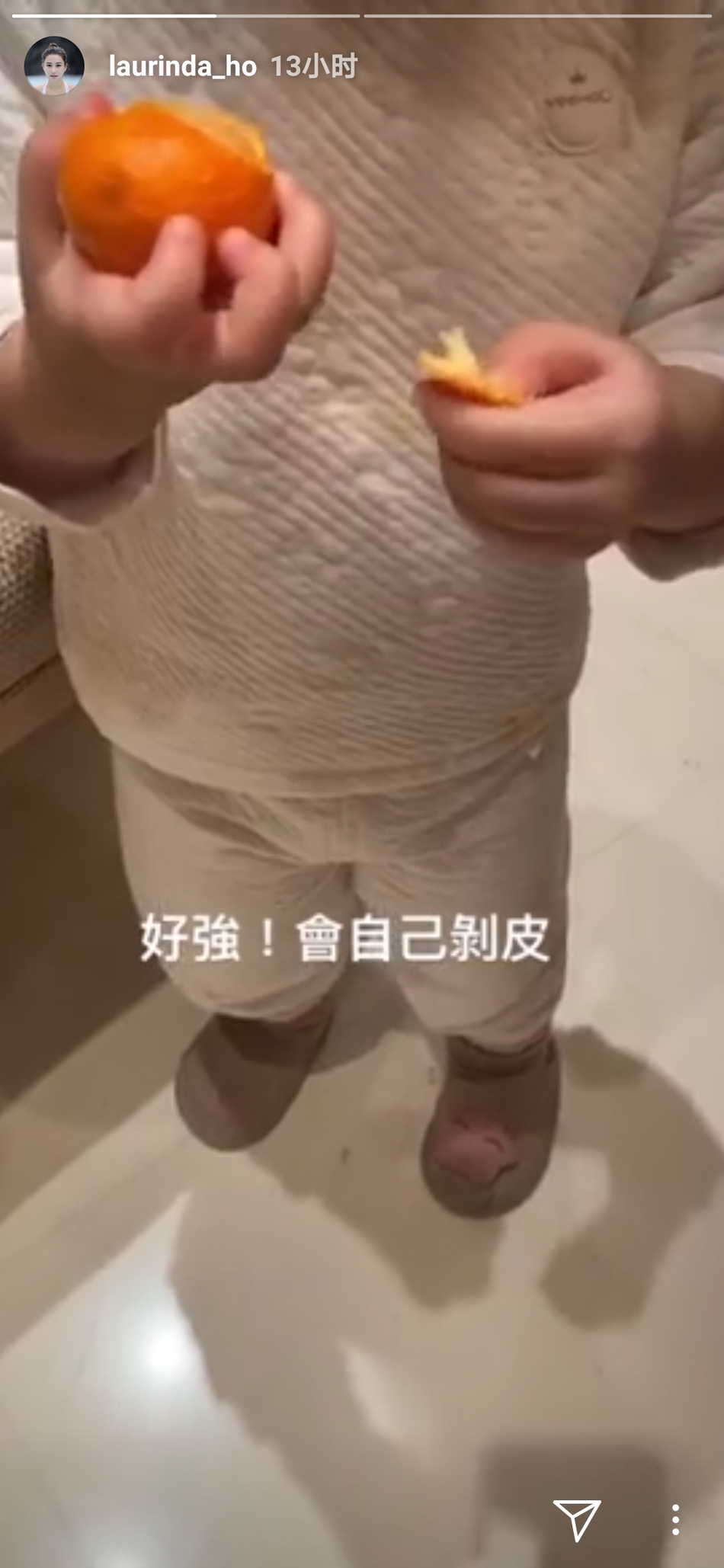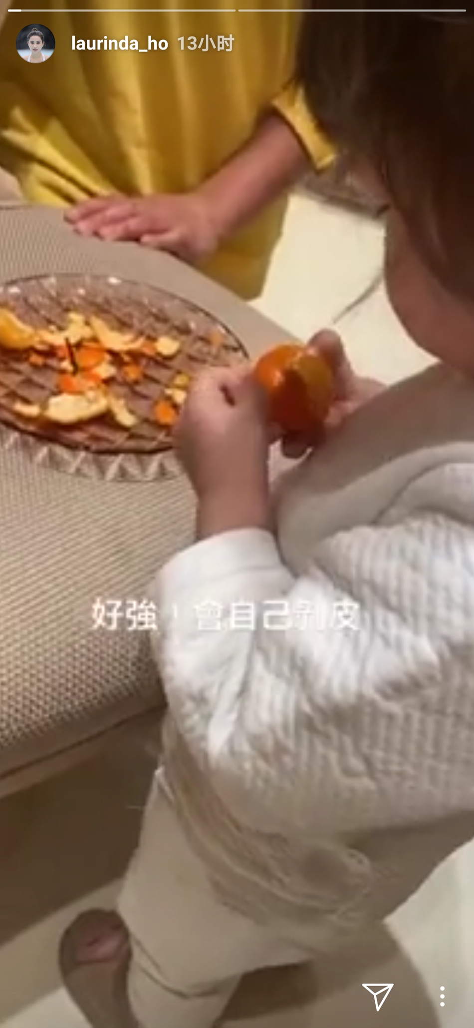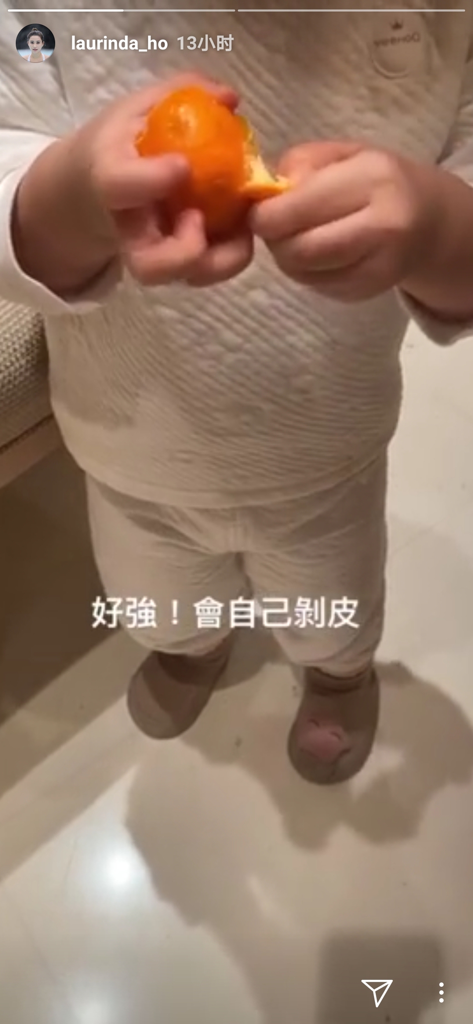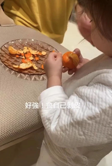 动态中,是一个大约两岁小女孩的侧脸,正在剥桔子,何超莲还配文赞美其“好强!会自己剥皮”。