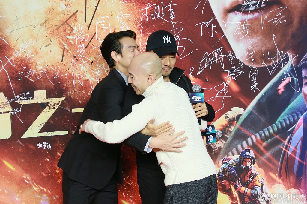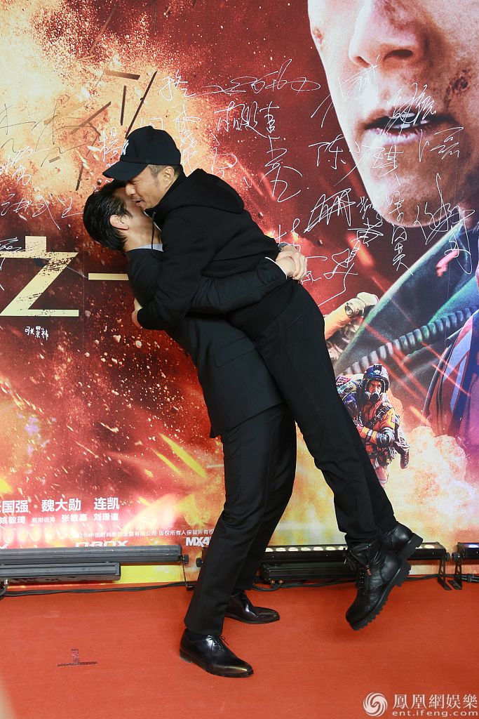 2020年1月15日,北京,彭于晏、张涵予、王彦霖、辛芷蕾、蓝盈莹等明星出席电影《紧急救援》首映礼。张涵予惊喜亮相,获彭于晏拥抱举