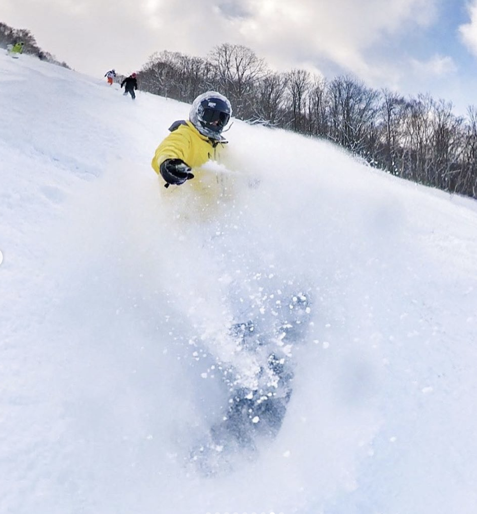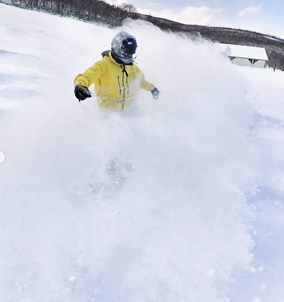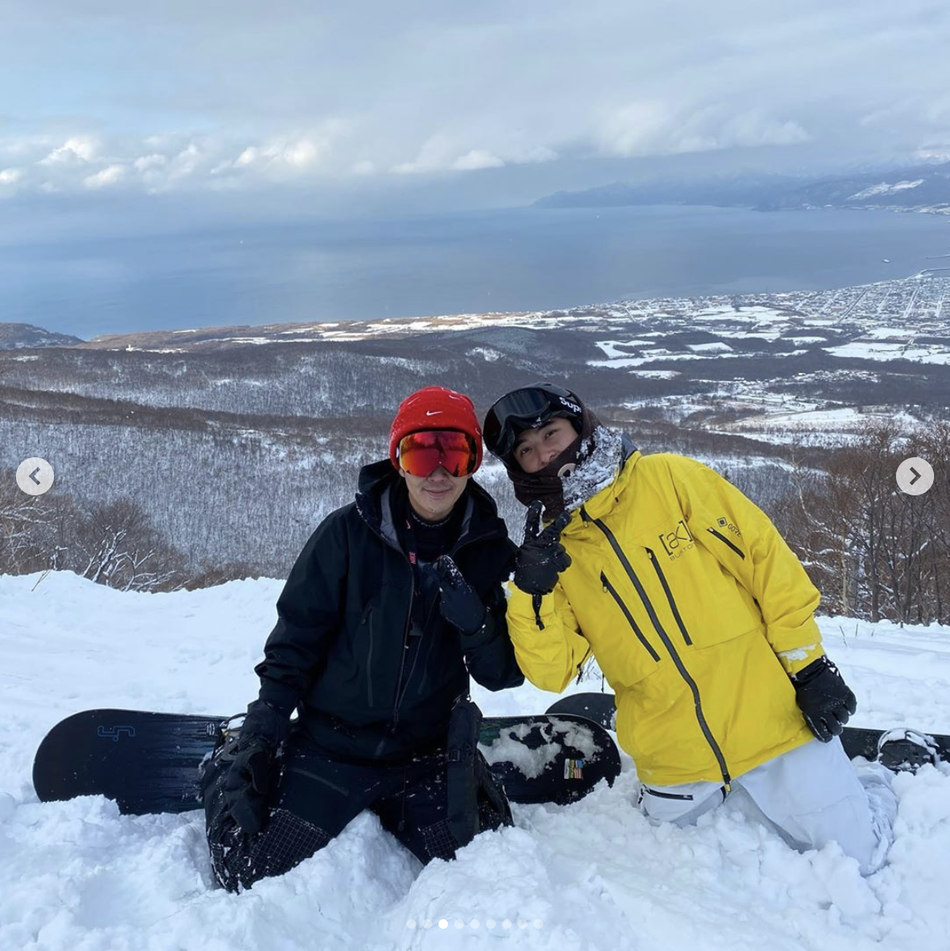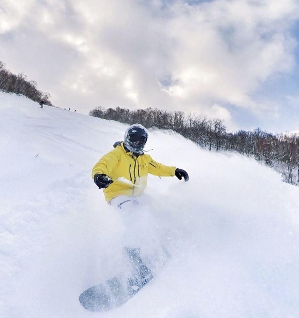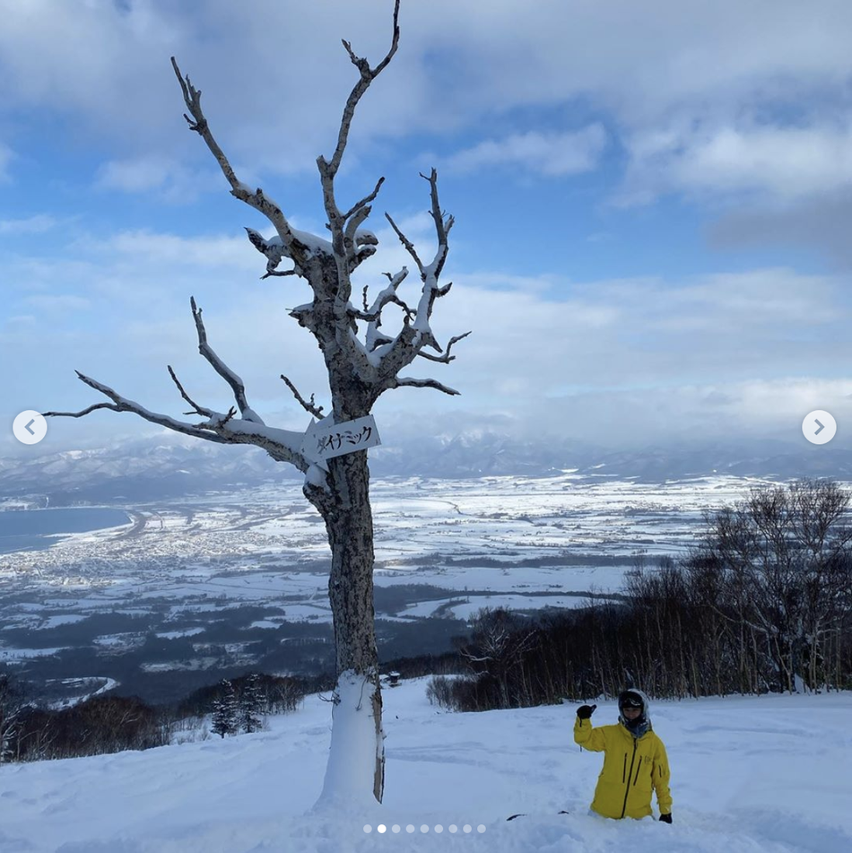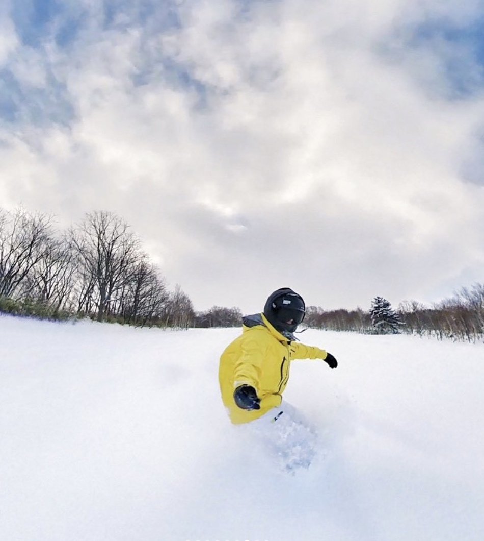 照片中他身穿黄色的冲锋服,脚踩单板,大秀滑雪技术。