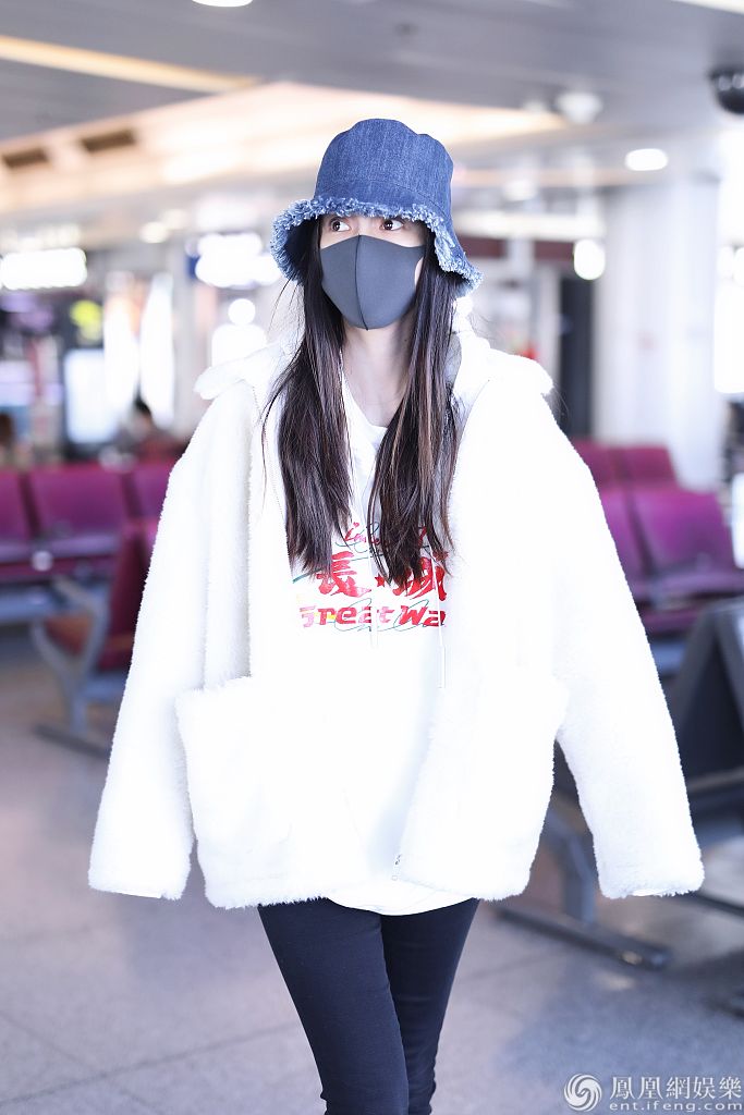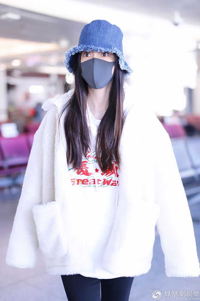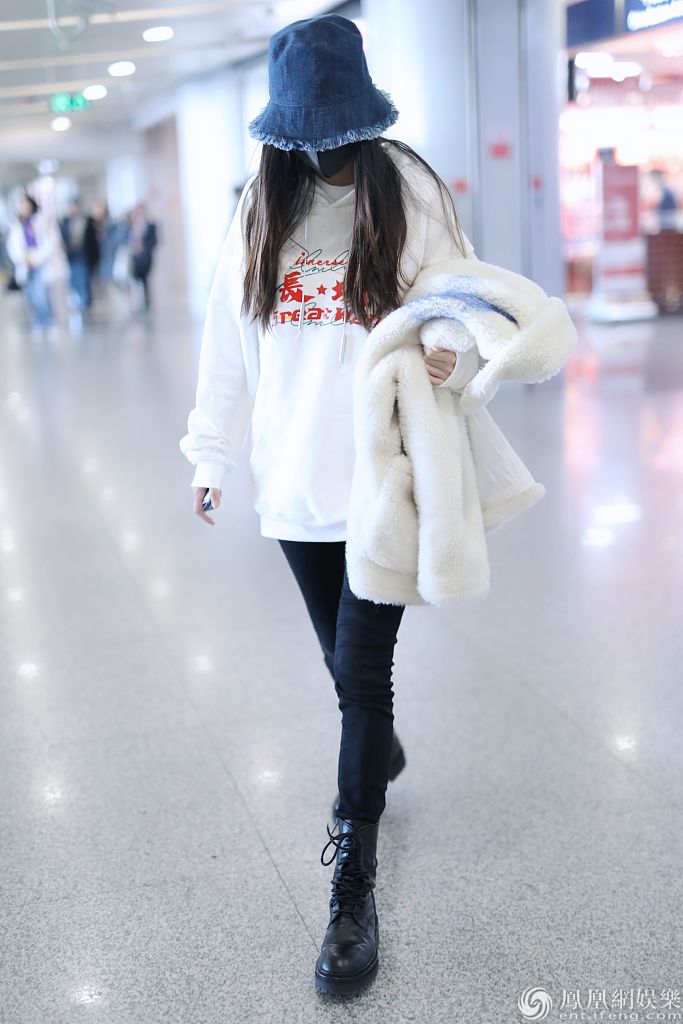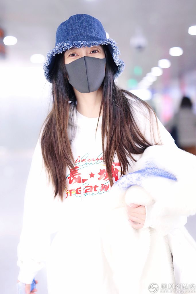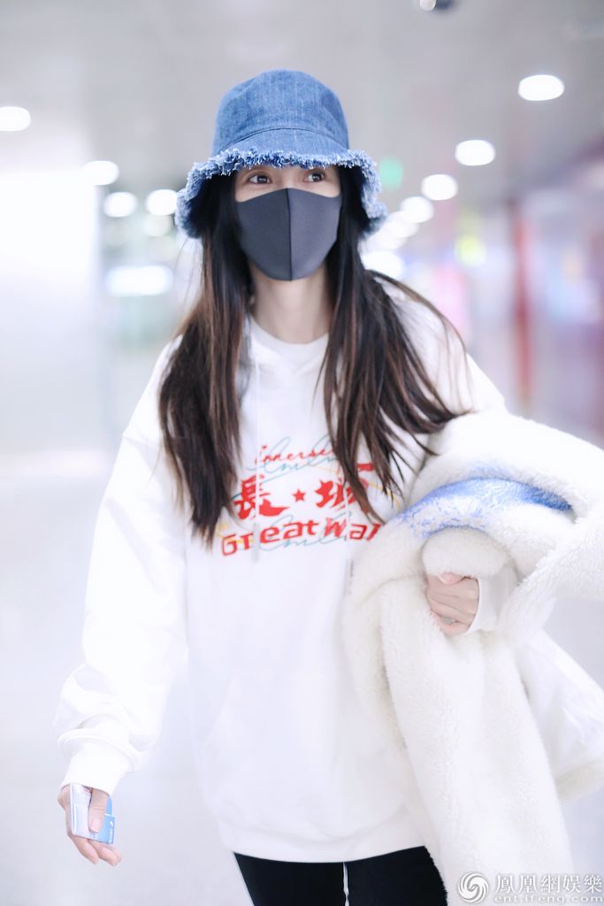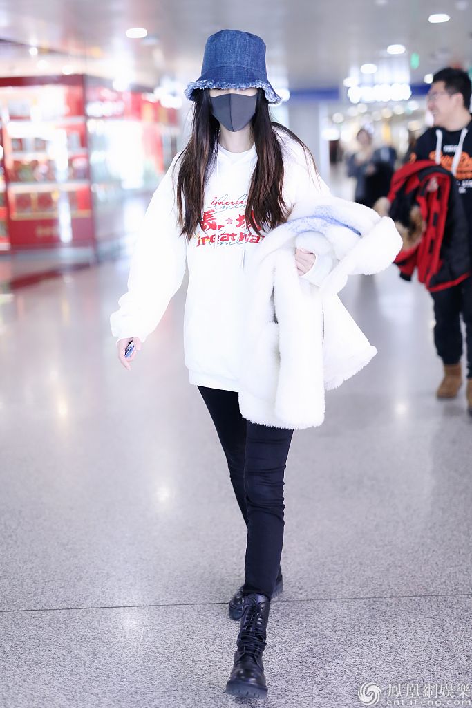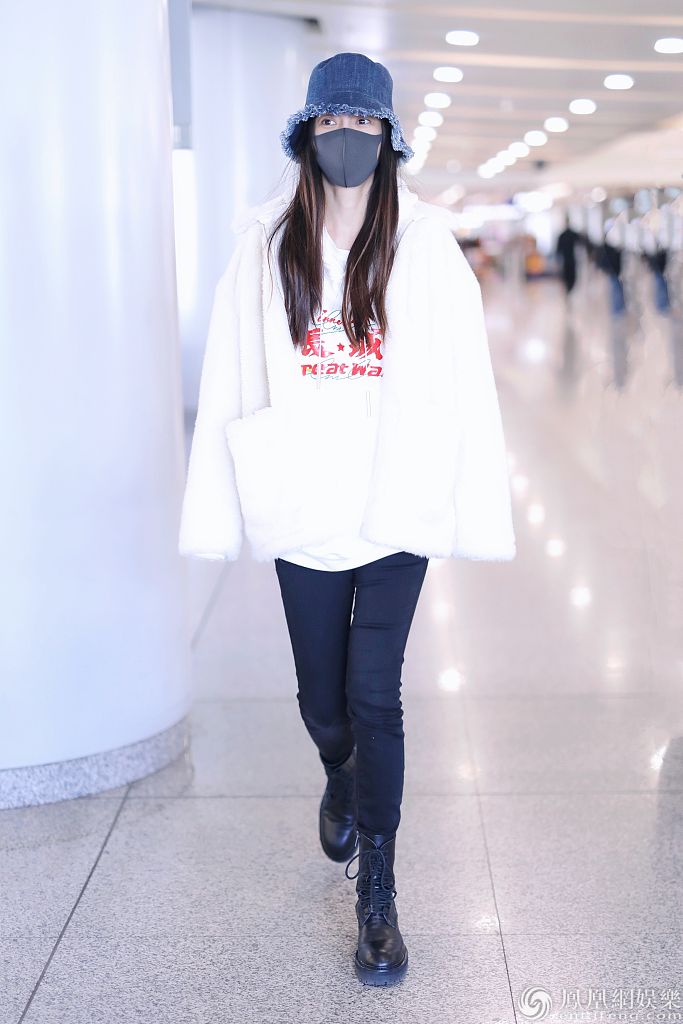 2020年1月15日,北京,杨颖现身机场。她穿“长城”字样的白色卫衣带领国潮风范,戴牛仔渔夫帽搭配马丁靴酷劲十
