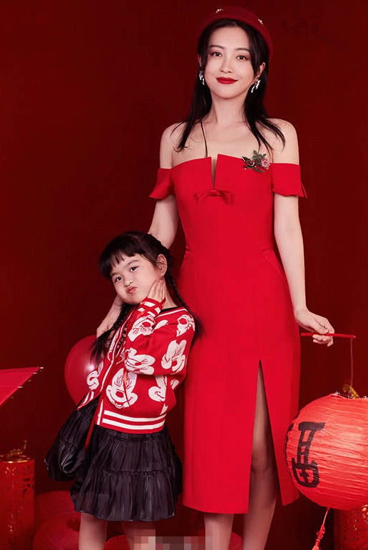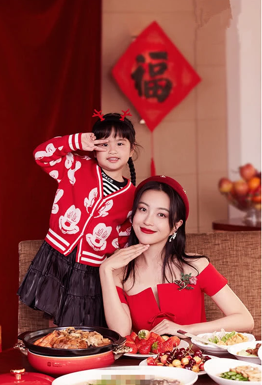 照片中,包文婧头戴红色针织帽长发披肩,身穿大红色修身连衣裙,一手提着大红灯笼一手搭在女儿肩头,一脸甜笑很是温柔。饺子身穿红色外套外搭黑色连衣裙,单手抚颈,上演歪头杀不忘对镜头嘟嘴卖萌,俏皮搞怪的她颇具小模特风范。
