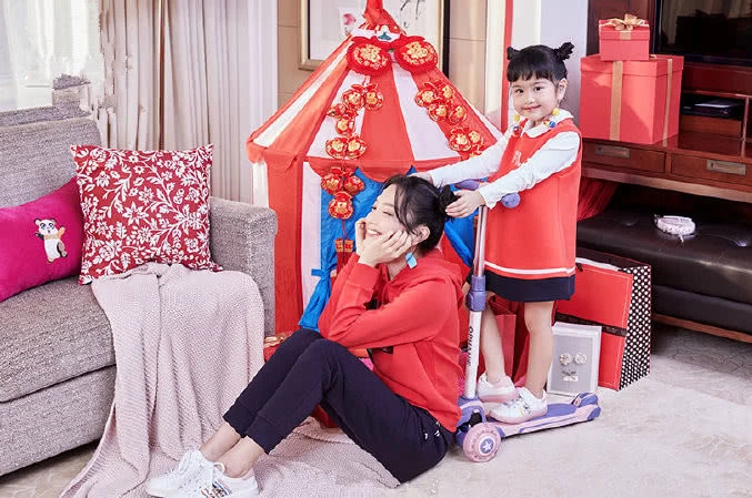 包文婧扎着哪吒头,身穿红色卫衣搭配黑色休闲裤坐在地毯上,双手抚脸开心大笑,骑着平衡车的饺子和妈妈扎着同款发型,不忘双手去摸妈妈的小啾啾,温馨有爱。