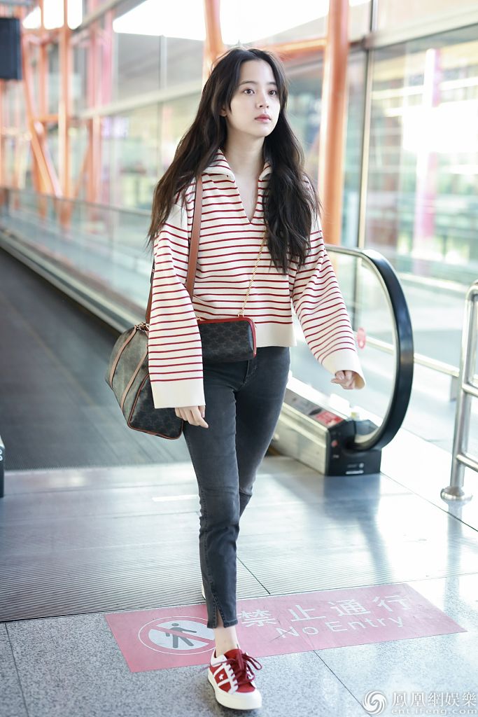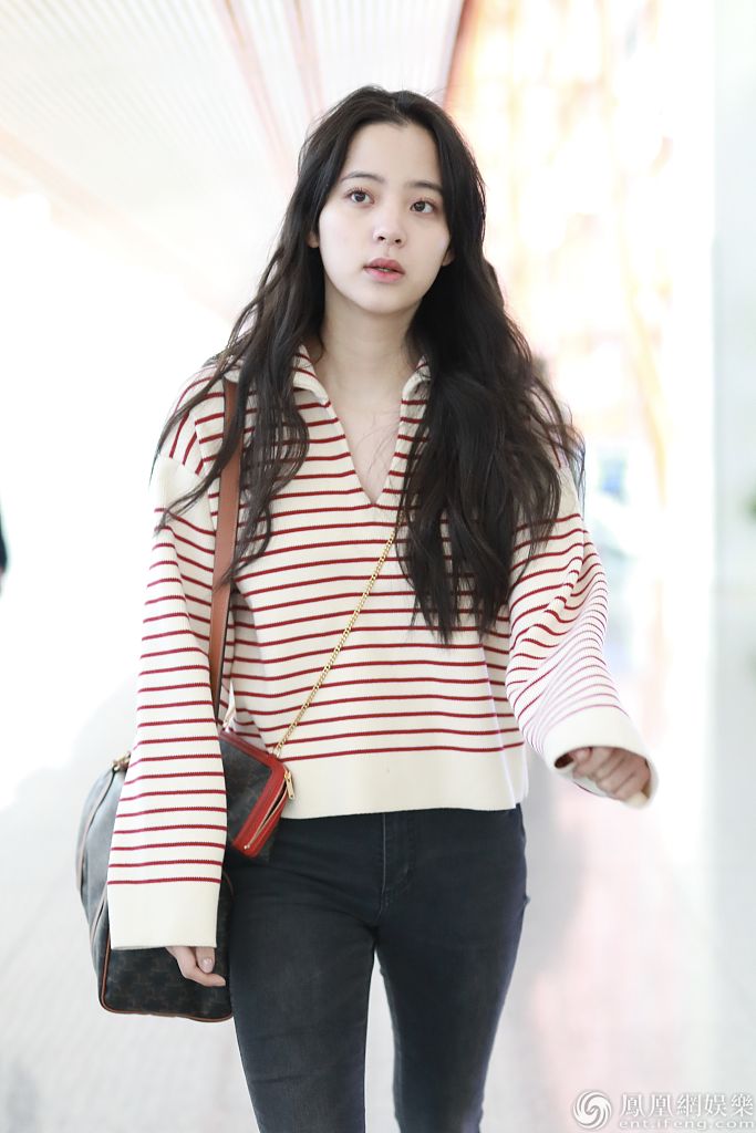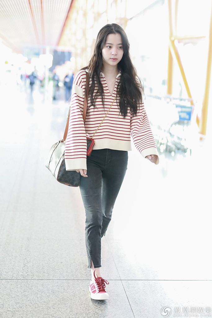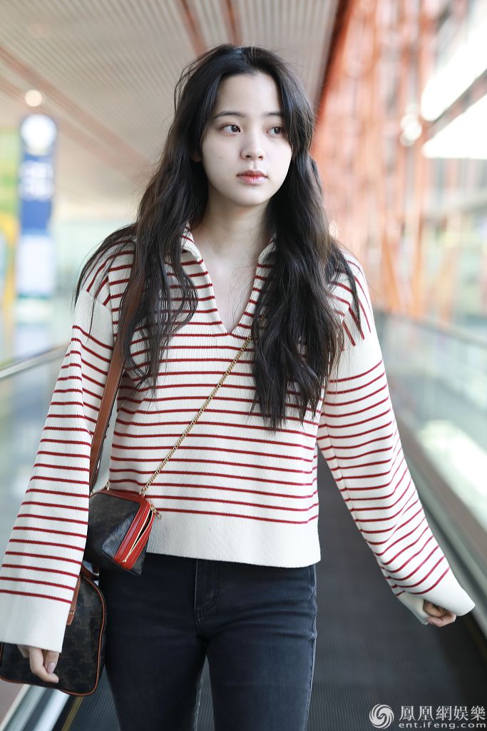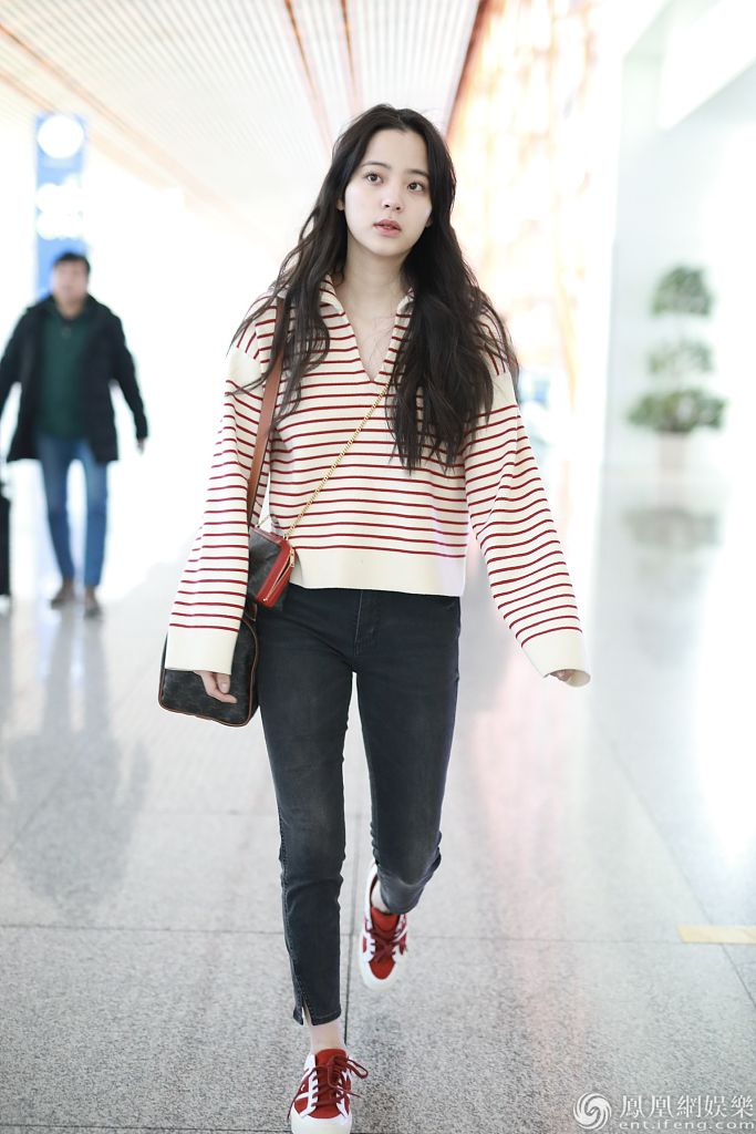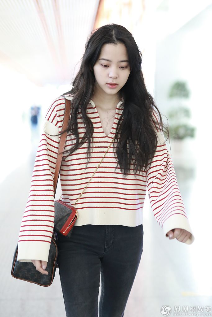 2020年1月15日,北京,欧阳娜娜现身机场前往珠海。她穿粉白条纹衫甜美清新,搭配简约黑裤大秀长腿,黑色的大波浪中分长发,是走轻熟风的甜美少女