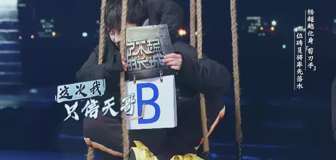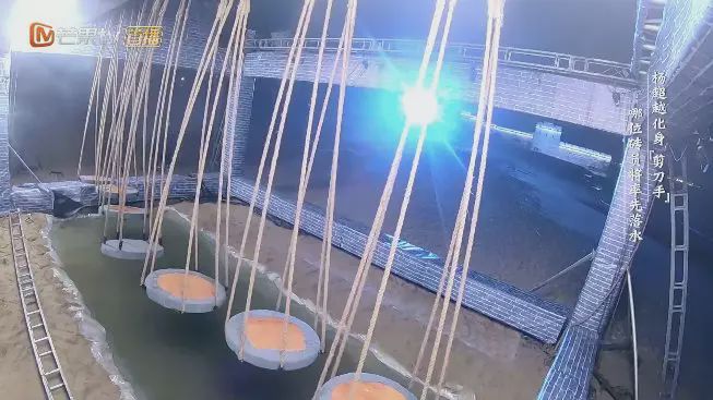 嘉宾坐在垫子上,被吊起来。每答错一道题就剪掉一根绳子,最后直接掉进水里。