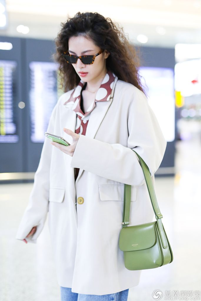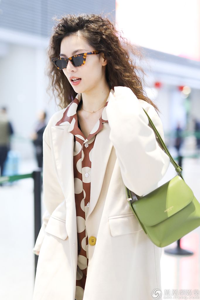 2020年1月14日,上海,钟楚曦现身机场。她烫羊毛卷走复古港风,穿西装提绿色包包凹造型,走在时尚前端,甜帅满