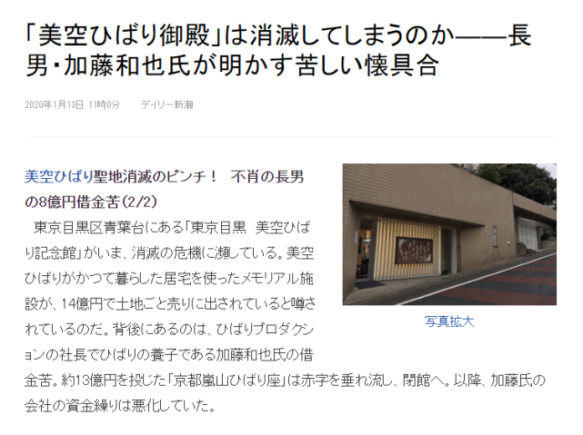 可惜在美空云雀提供的优渥条件下,加藤和也却辜负了养母的期望。他接受管理的云雀制作公司因运营不善,陷入了财务危机,就连养母故居改成的纪念馆,也为了周转资金传出以14亿日元(约人民币8700万元)出售的消息。加藤和也的事业失利,被迫出售养母故居来减轻债务的消息也被传得沸沸扬扬。毕竟在网友们心目中,能纪念美空云雀的一切都神圣不可亵渎。